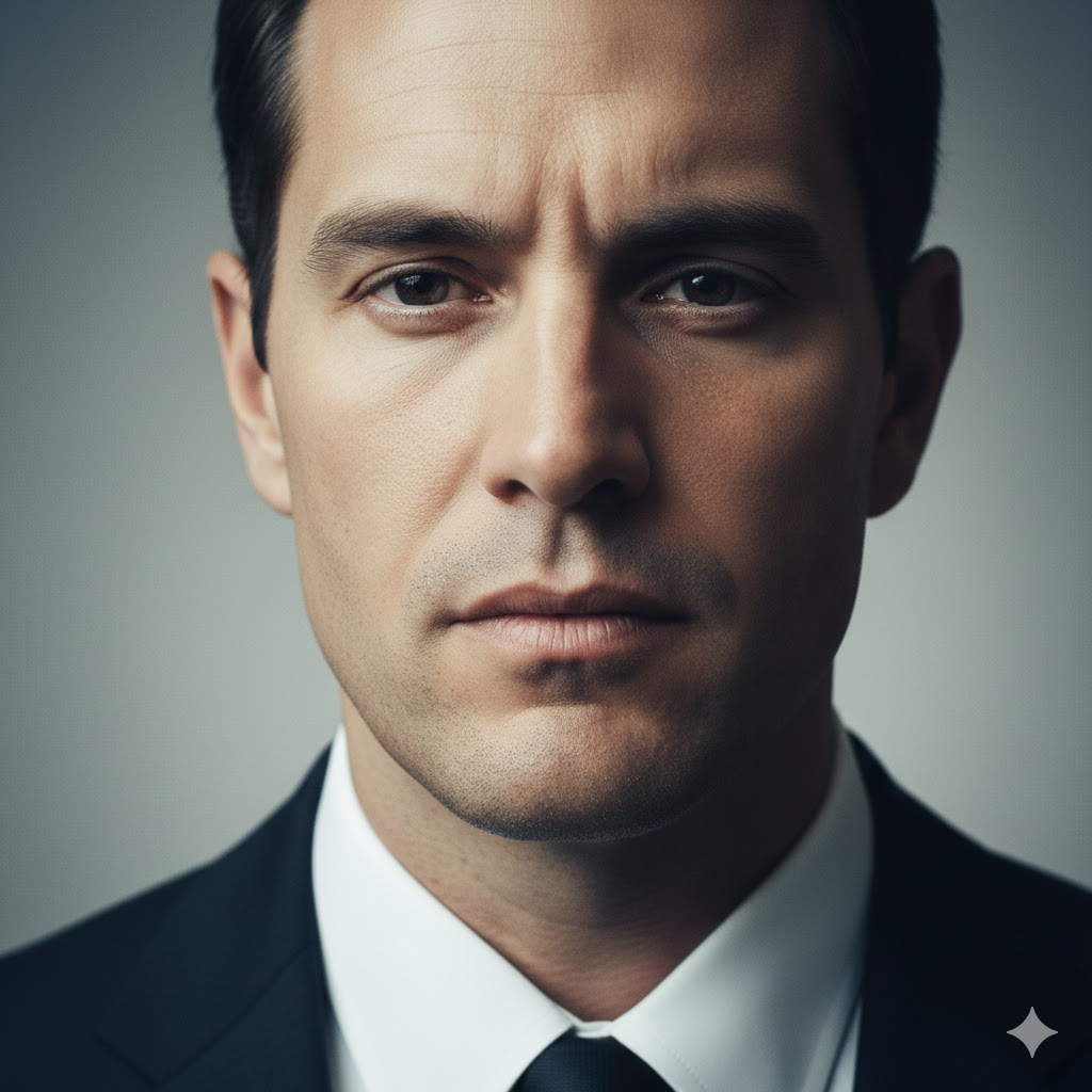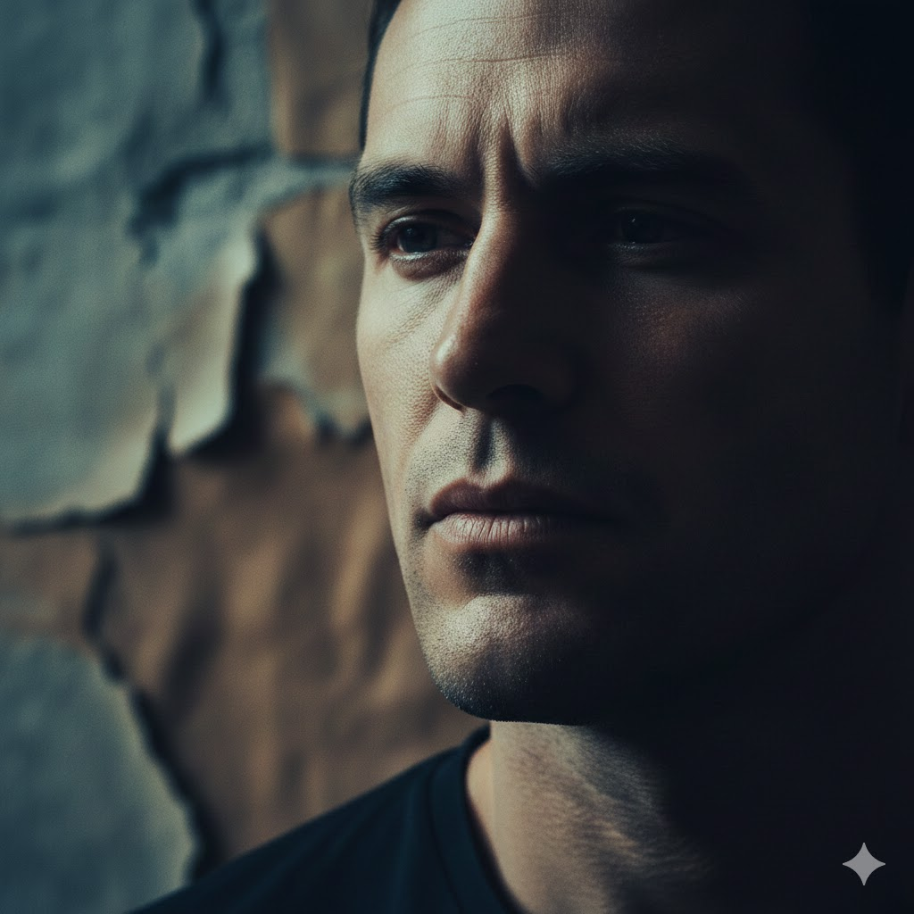“Create a cinematic male portrait with dramatic lighting, emphasized jawline, deep shadows, moody background, intense yet natural expression, film-style color grading, and ultra-sharp 4K resolution. Maintain realistic skin texture.”