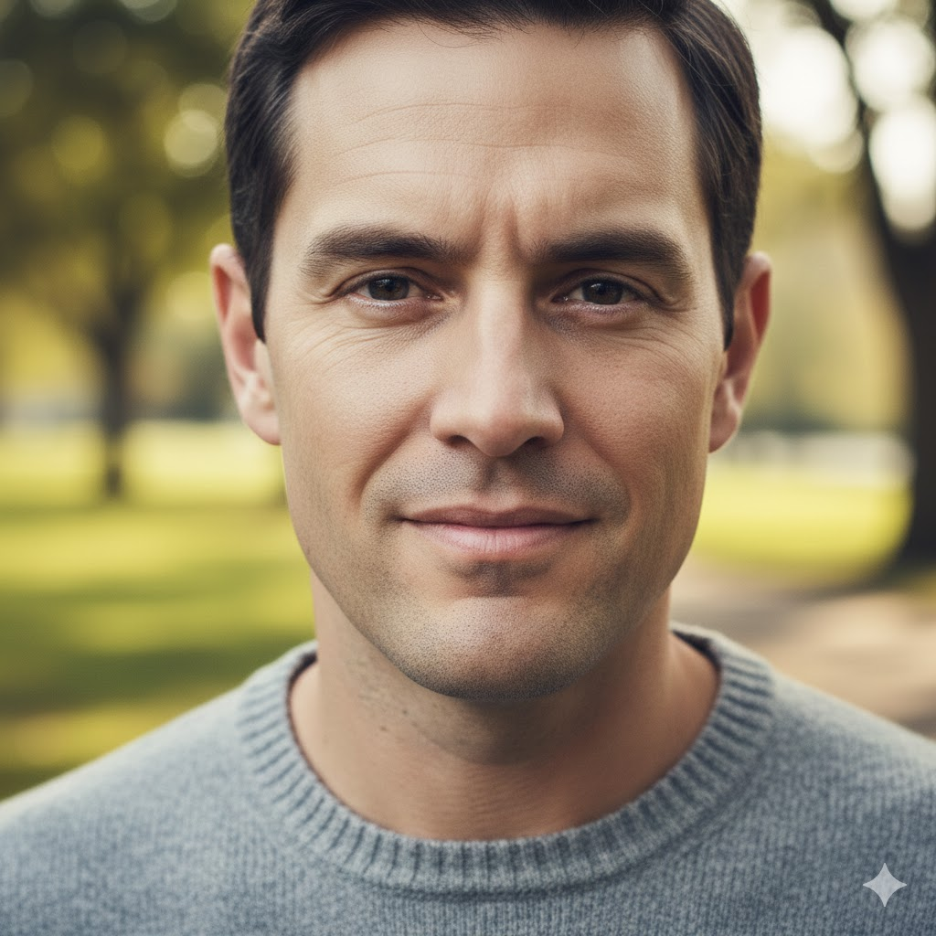 “Enhance this image into a natural lifestyle portrait with soft daylight, relaxed expression, realistic skin tones, casual outfit, outdoor blurred background, and high-detail 4K HD quality. No artificial smoothing.”