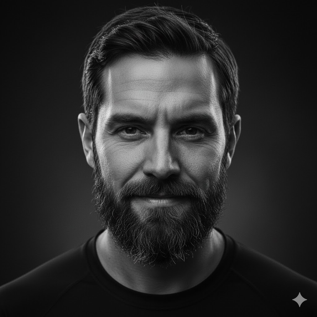 “Convert this photo into a timeless black-and-white male portrait with strong contrast, rich textures, dramatic lighting, sharp facial features, and professional 4K resolution.”