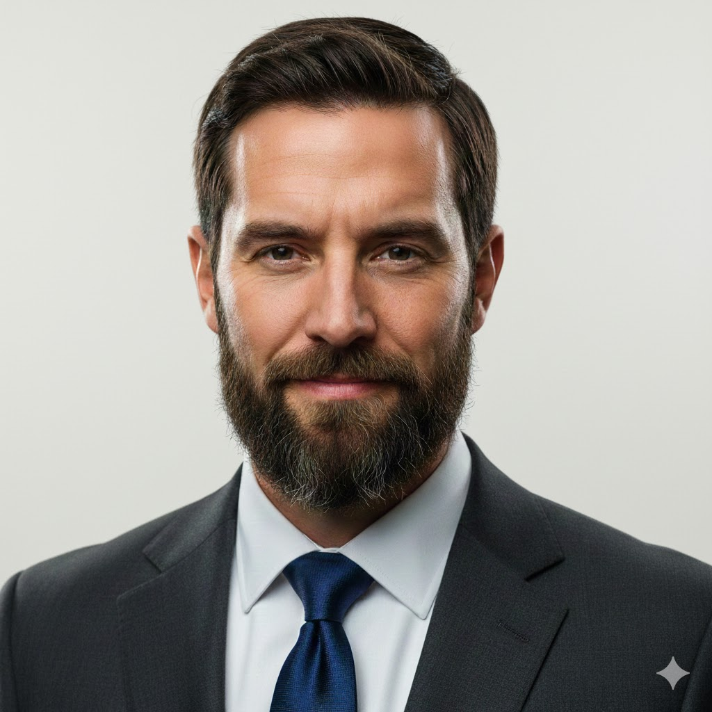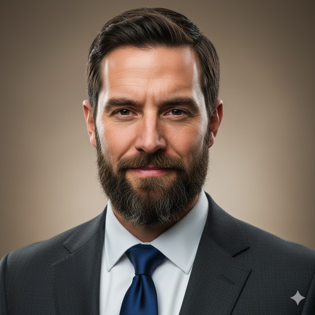 “Create a powerful executive-style portrait with premium studio lighting, confident expression, clean grooming, luxury neutral background, realistic skin texture, and ultra-detailed 4K HD quality.”