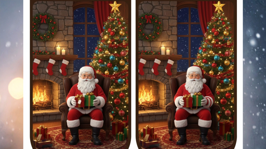 La Navidad es sinónimo de calidez, luces suaves y momentos acogedores en casa. Estas imágenes reflejan perfectamente ese espíritu festivo: un árbol de Navidad decorado, una chimenea encendida, velas brillando y regalos colocados con cuidado. A simple vista, las dos imágenes parecen idénticas.