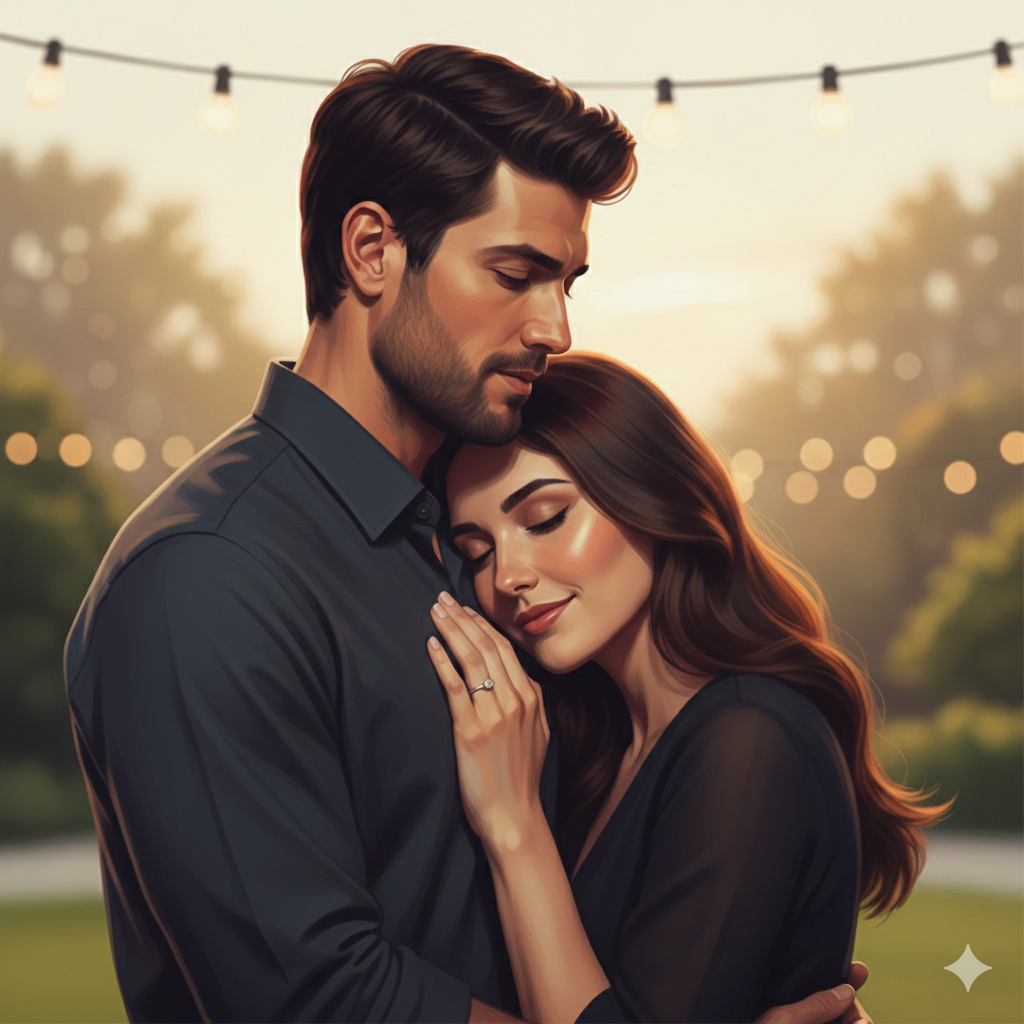 Create a realistic candid romantic pose using the attached couple photo. Faces unchanged. Soft expressions, subtle emotions, natural lighting, intimate atmosphere.