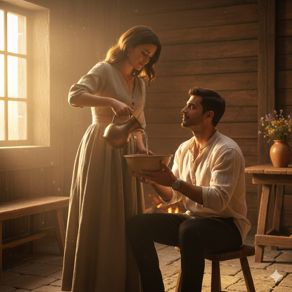 Create a peaceful rustic scene where soft golden light filters in. The woman pours water gently while the man watches lovingly. Hyper-realistic textures, serene mood.