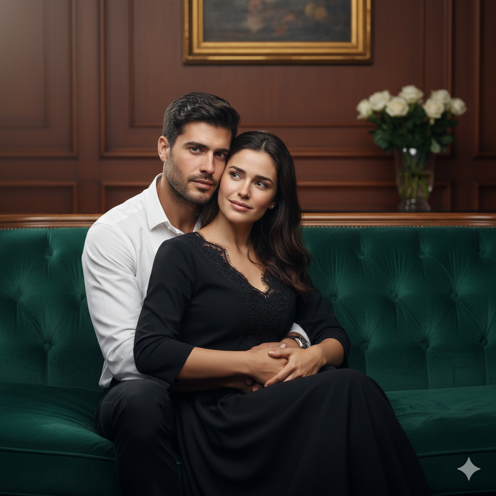 Create a plush indoor romantic portrait on a velvet sofa. Soft lighting, dreamy expressions, editorial-style photography.