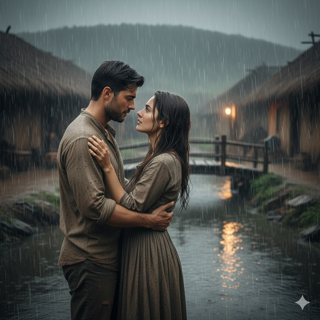Create a village riverside rain scene. Emotional eye contact, wet clothes, dreamy reflections, poetic romance.