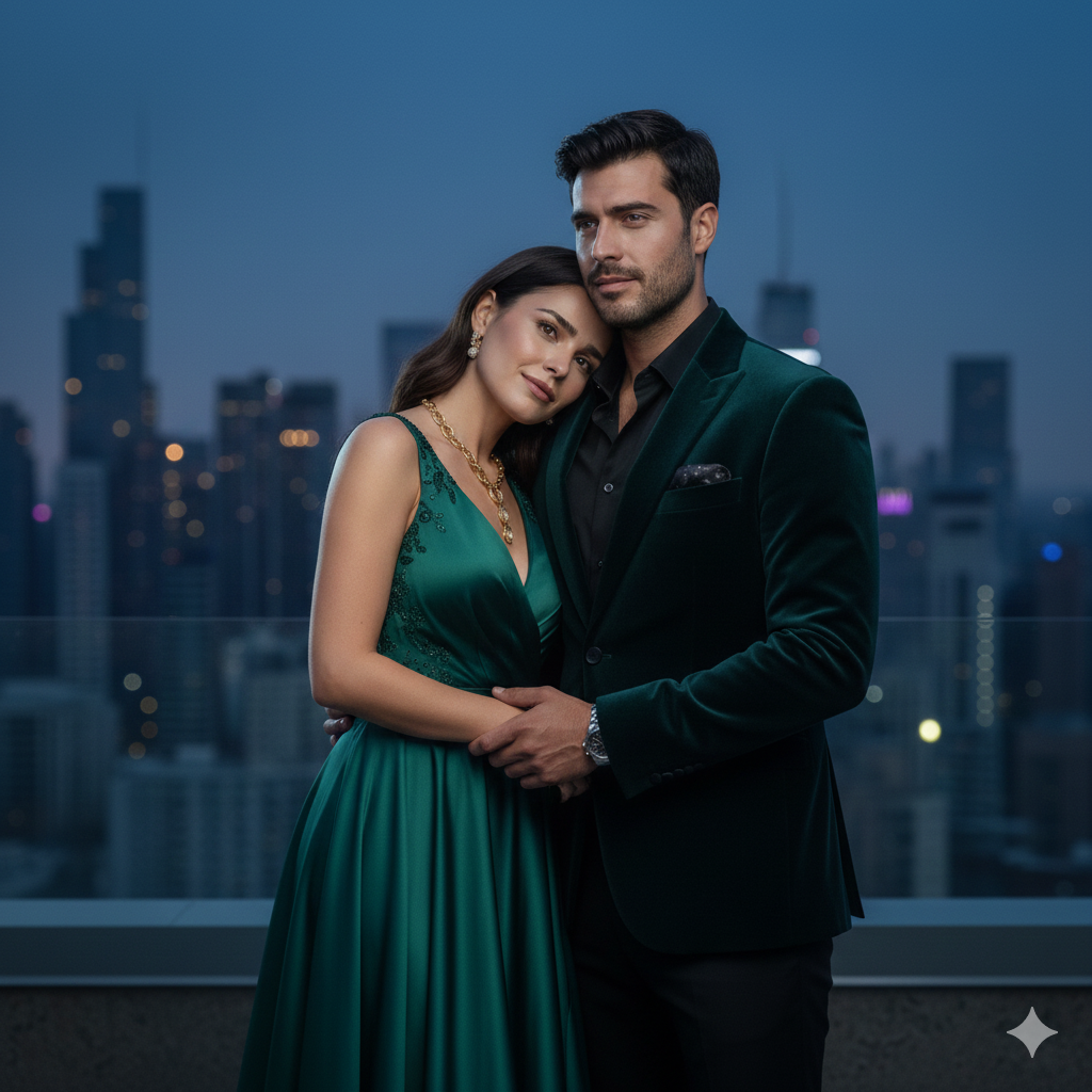 Create a cinematic rooftop night portrait with moonlight and blurred skyline. Elegant outfits, intimate pose, high realism.