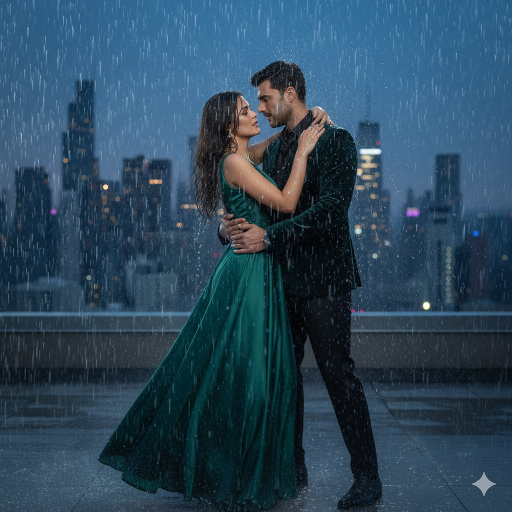 Create a Bollywood-inspired rain song moment. Dramatic lighting, rain-soaked outfits, intense romantic expressions.
