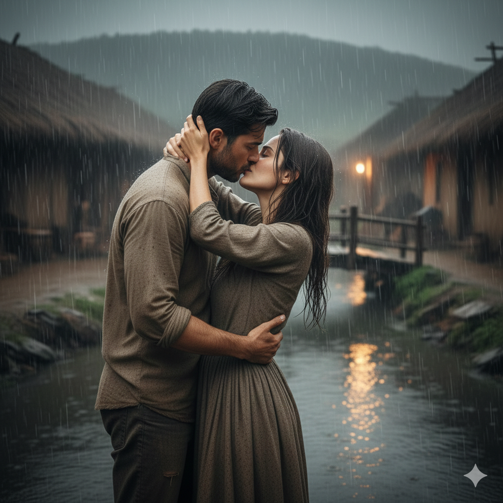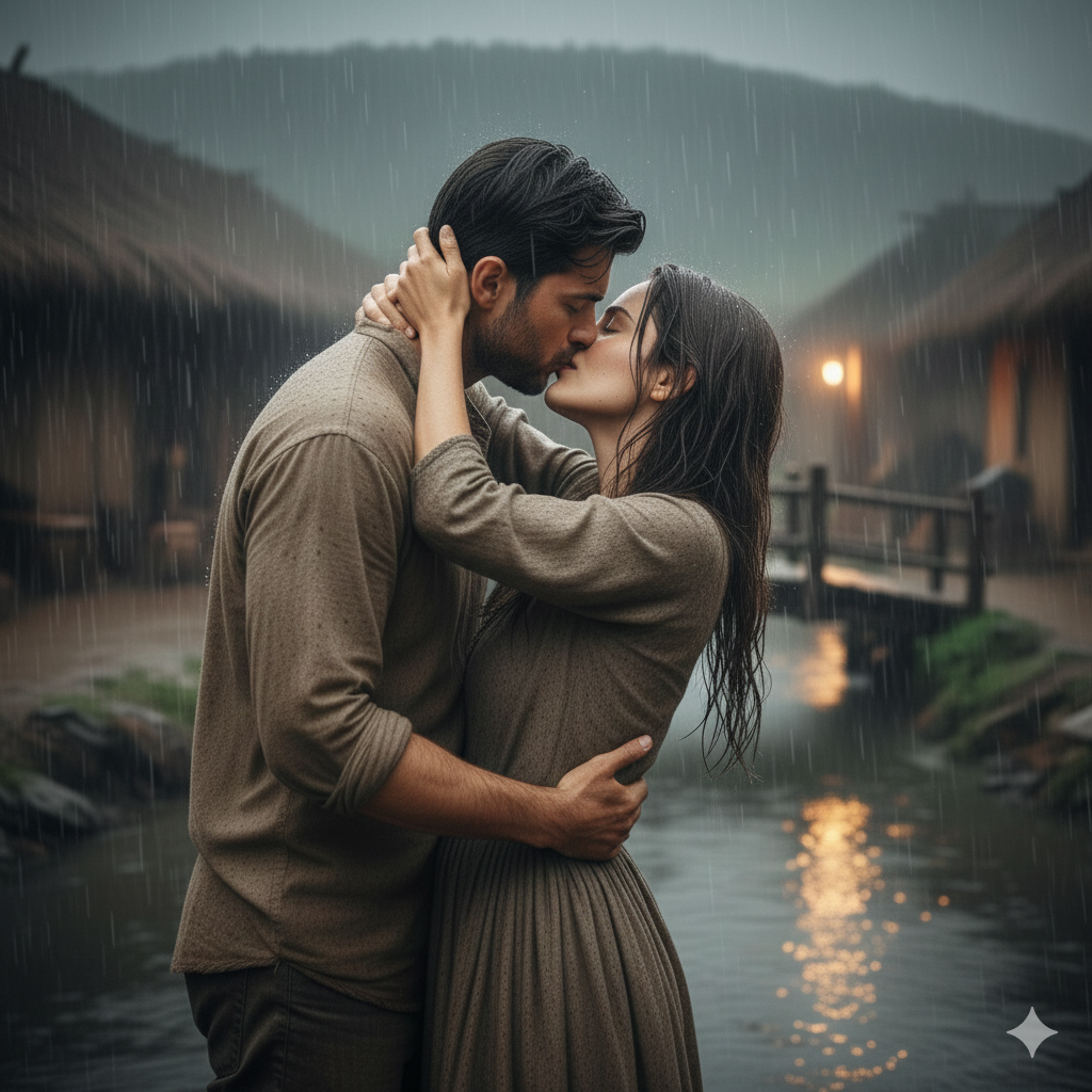 Create a cinematic village kiss scene with emotional intensity. Circular romantic pose, realistic skin texture, HD lighting.