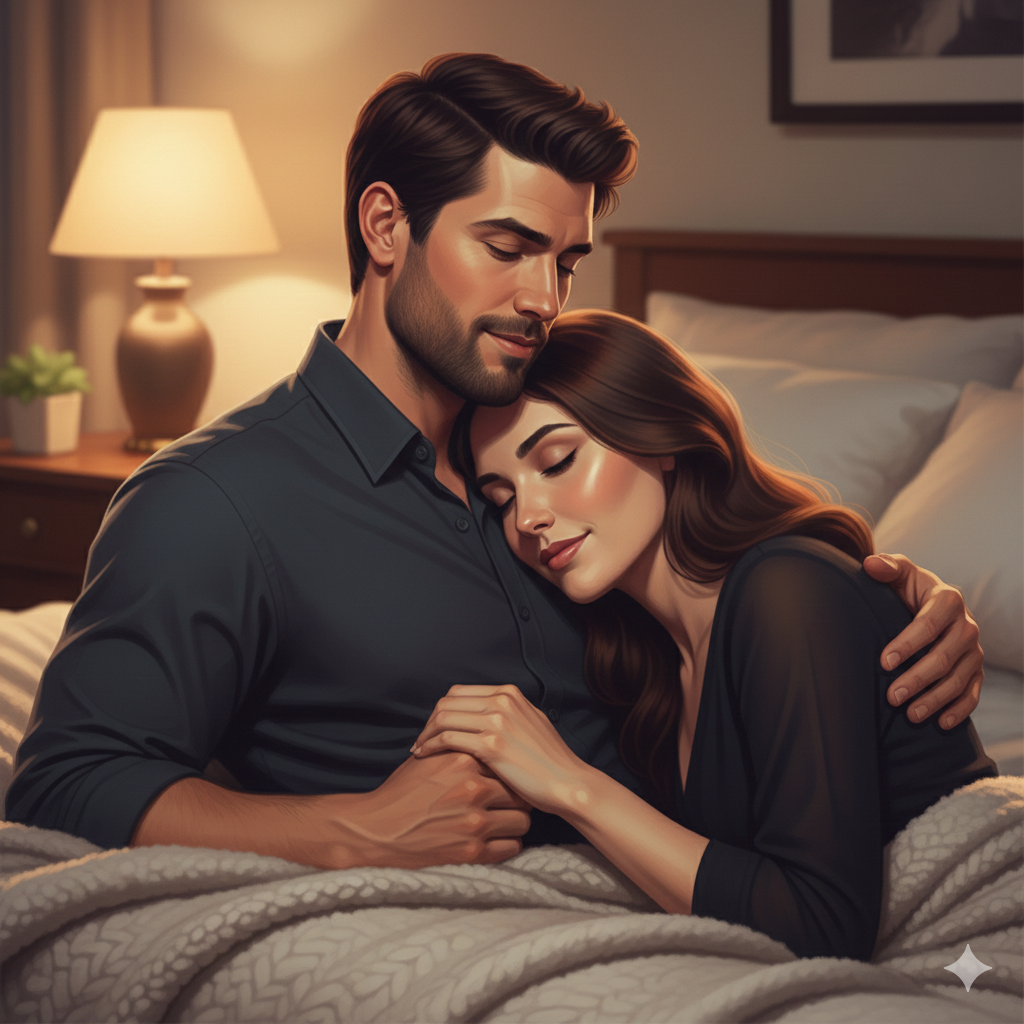 Generate a calm romantic indoor scene where the couple lies together peacefully. Gentle expressions, warm light from a window, intimate realism. 100% face match