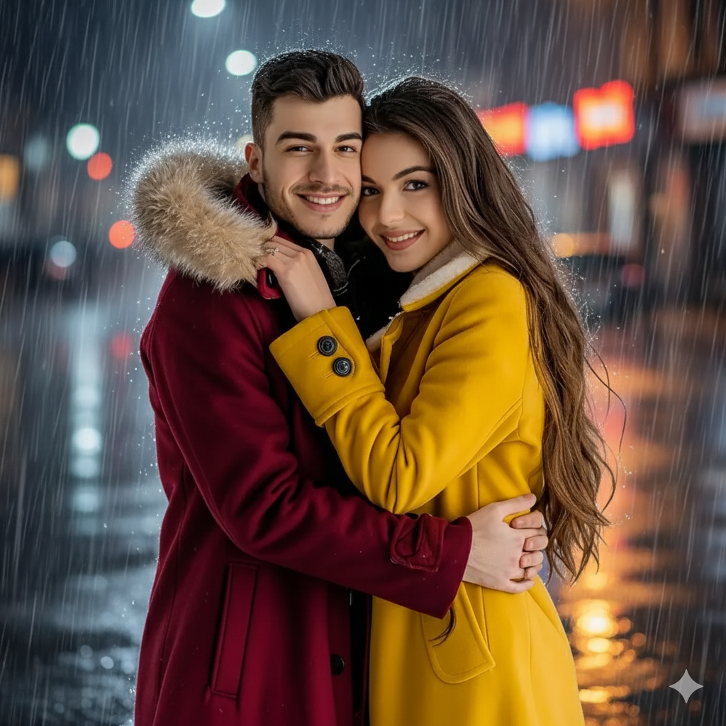 Create a cinematic rainy-night scene. Heavy rain, soft moonlight, wet road reflection. The man hugs the woman from behind. Romantic, emotional, ultra-realistic. Keep faces exactly the same.