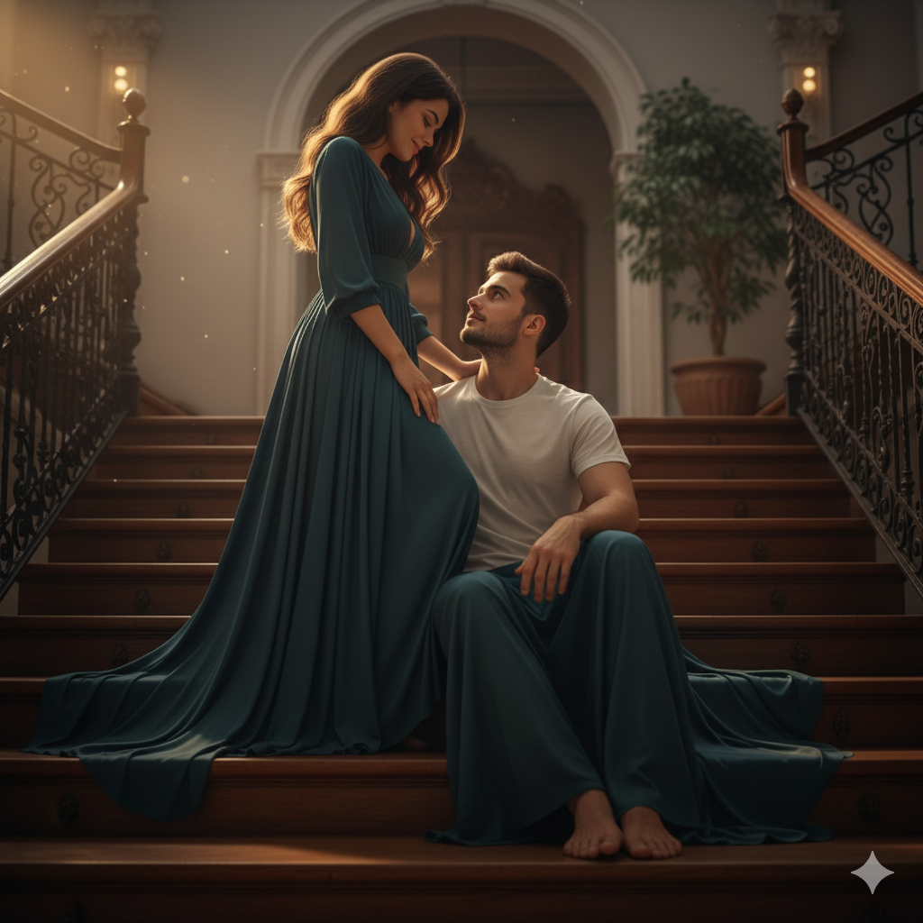 Create a sensual yet elegant pose on a wooden staircase. Flowing attire, relaxed body language, cinematic framing. Keep facial details untouched.