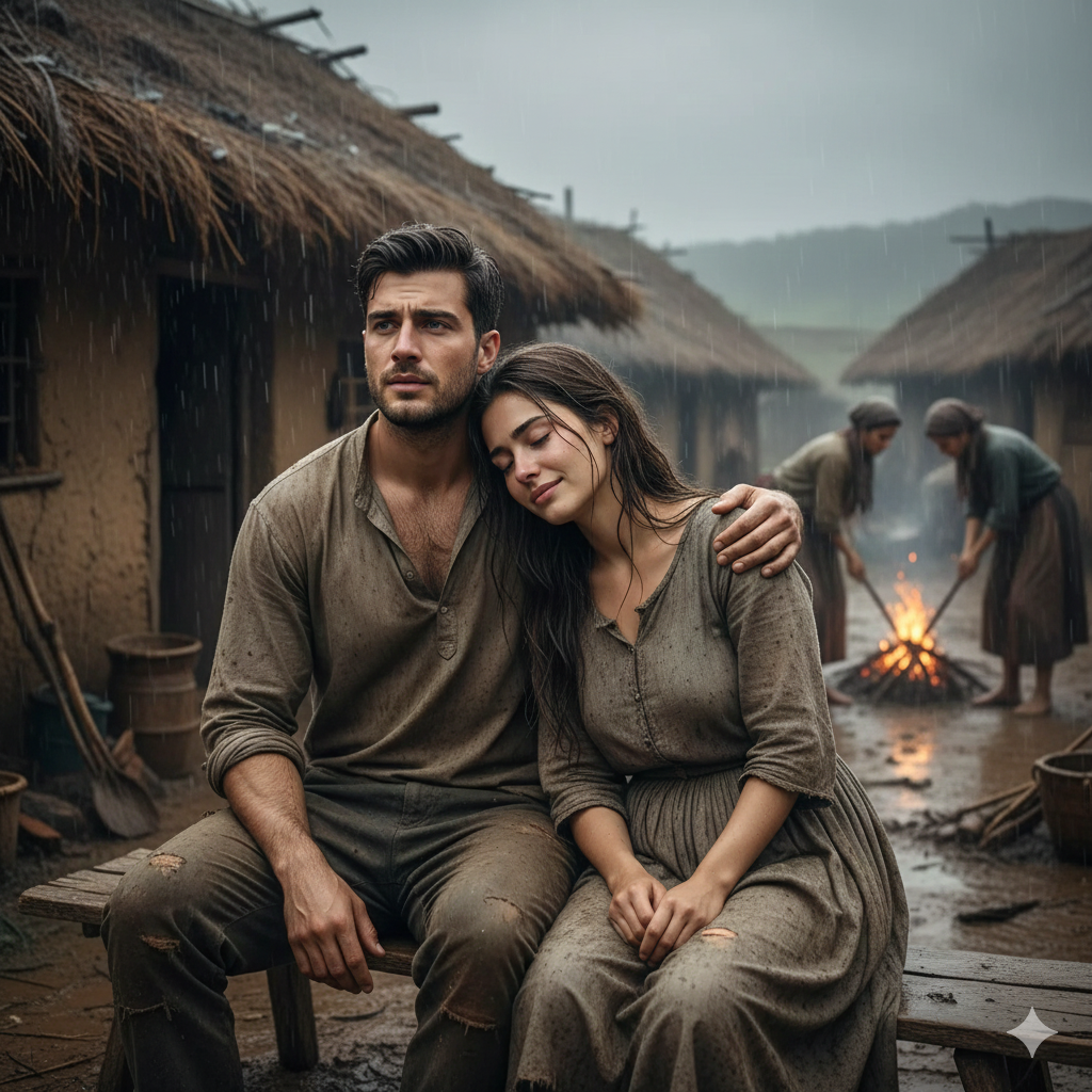 Create a hyper-realistic village life scene showing emotional bonding during hardship. Natural expressions, worn clothes, deep storytelling. Faces exactly same as reference.