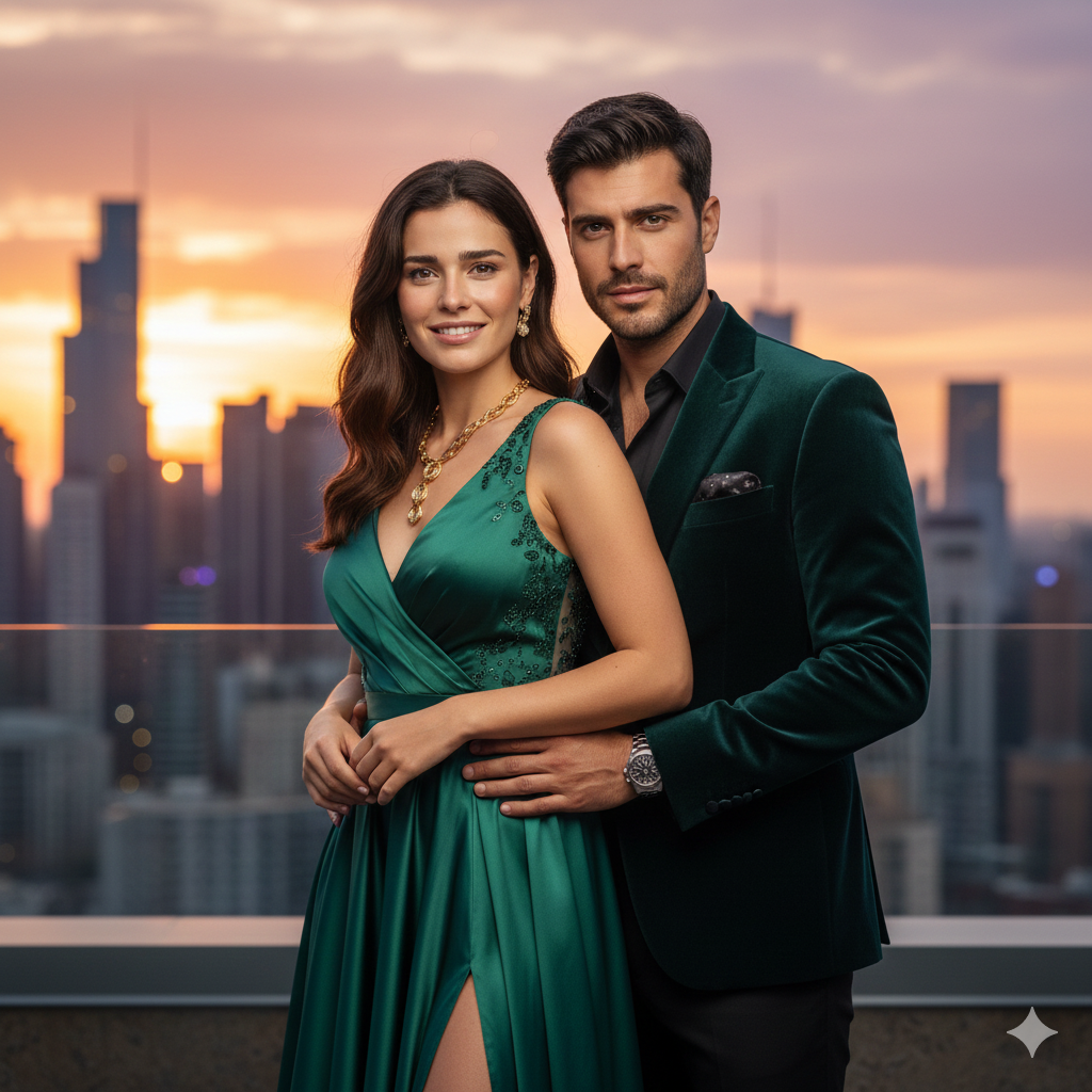 Create a half-body terrace portrait at golden hour. Elegant outfits, confident expressions, city vibes. Ultra-HD cinematic style.