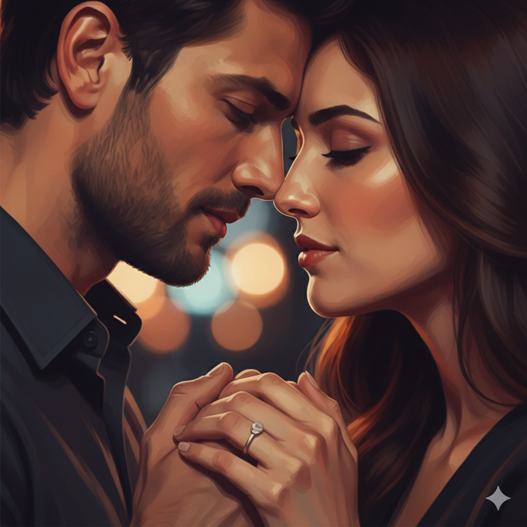 Use the attached couple photo as reference. Keep faces unchanged. Create an intimate close-up where the man leans gently toward the woman, hands clasped together. Soft lighting, romantic mood, cinematic depth. No face alteration.