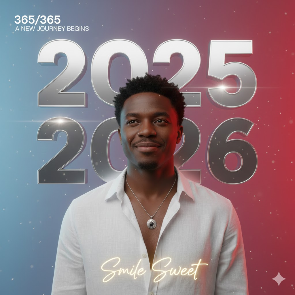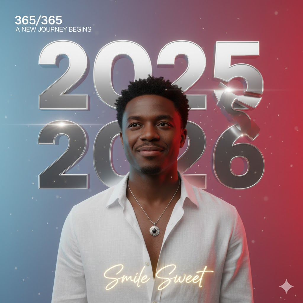 A high-quality 3D New Year transition poster. Large bold text “2025” in the background, with the number ‘5’ sliding upward to reveal “2026”. Top corner text: “365/365” and “A NEW JOURNEY BEGINS”. Center subject wearing an open white shirt with a black locket. Dual-tone gradient background (light blue and red). Stylish cursive text at the bottom: “Smile Sweet”. Ultra-clean, cinematic look.