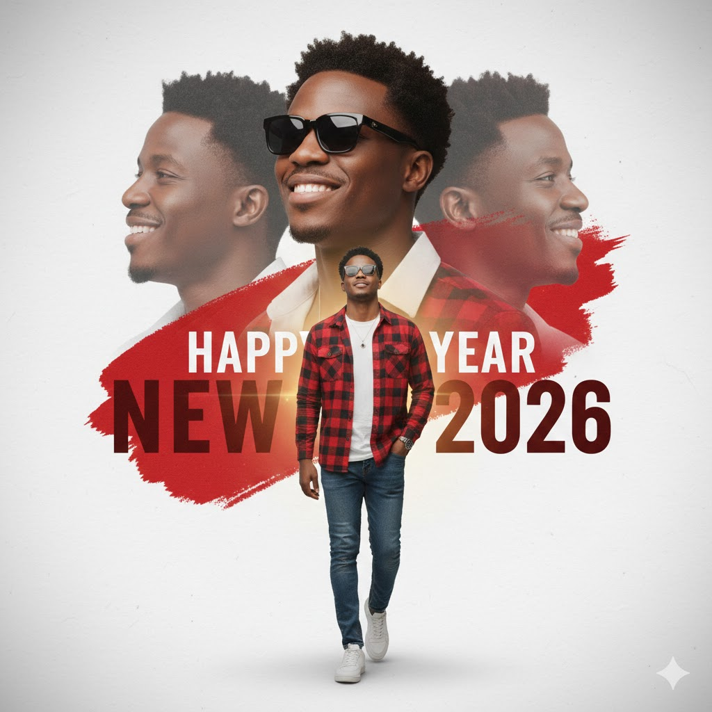 Cinematic HAPPY NEW YEAR 2026 poster collage using the same reference face exactly. Main full-body figure walking forward with one hand in pocket, wearing jeans and a checkered shirt with sports shoes. Large upper portrait in white shirt and sunglasses, layered with faded side profiles. White paper-textured background with bold red paint brush stroke, subtle grain, soft vignette, warm glow.