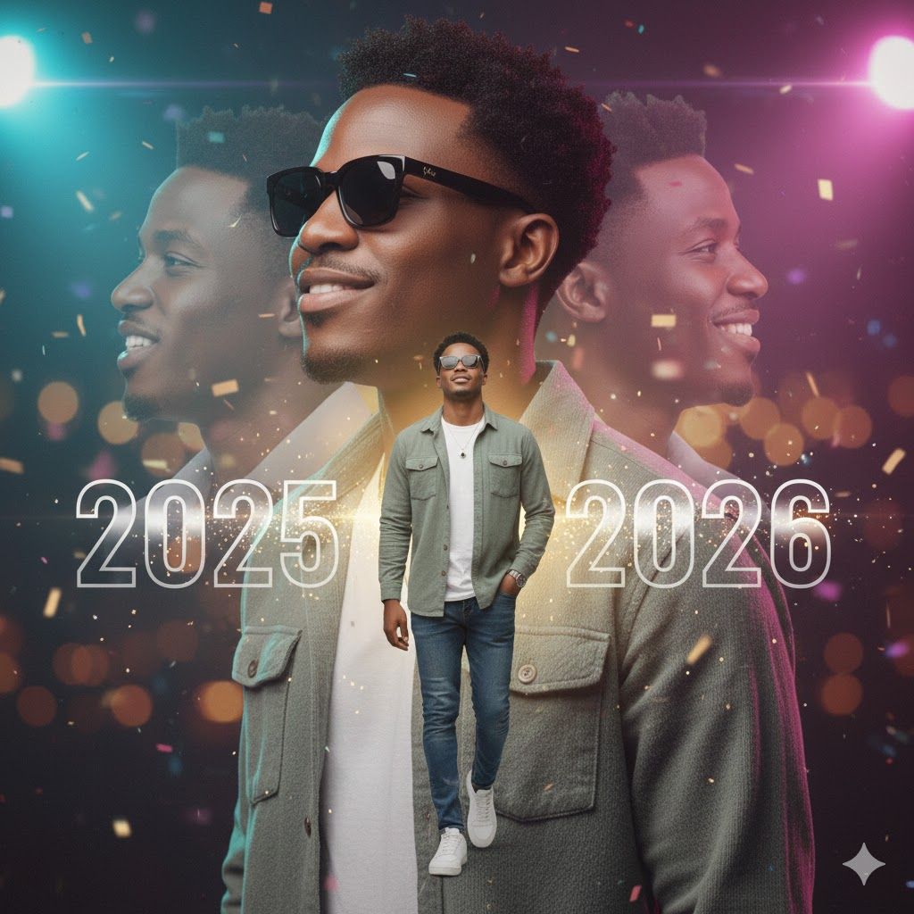 A premium cinematic portrait with royal golden lighting. Subject wearing a dark outfit, confident pose, soft shadows. Add metallic gold “2026” typography with light flares and confetti. Studio-quality realism.
