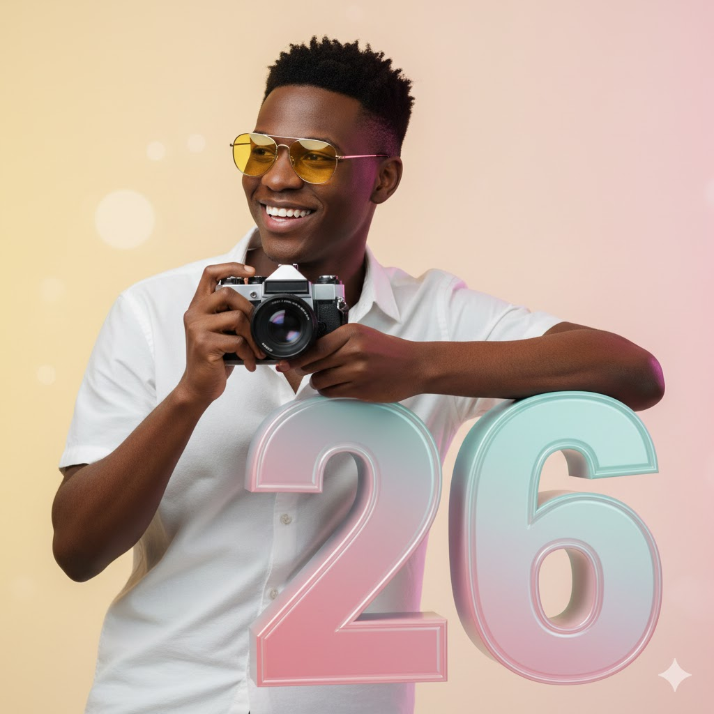 A cheerful cinematic portrait of a smiling young man wearing yellow-tinted aviator sunglasses and a white short-sleeve shirt. He holds a vintage DSLR camera while leaning casually on large glossy 3D “26” numbers in pink and teal tones. Soft gradient background, studio lighting, realistic skin texture, Happy New Year vibe.